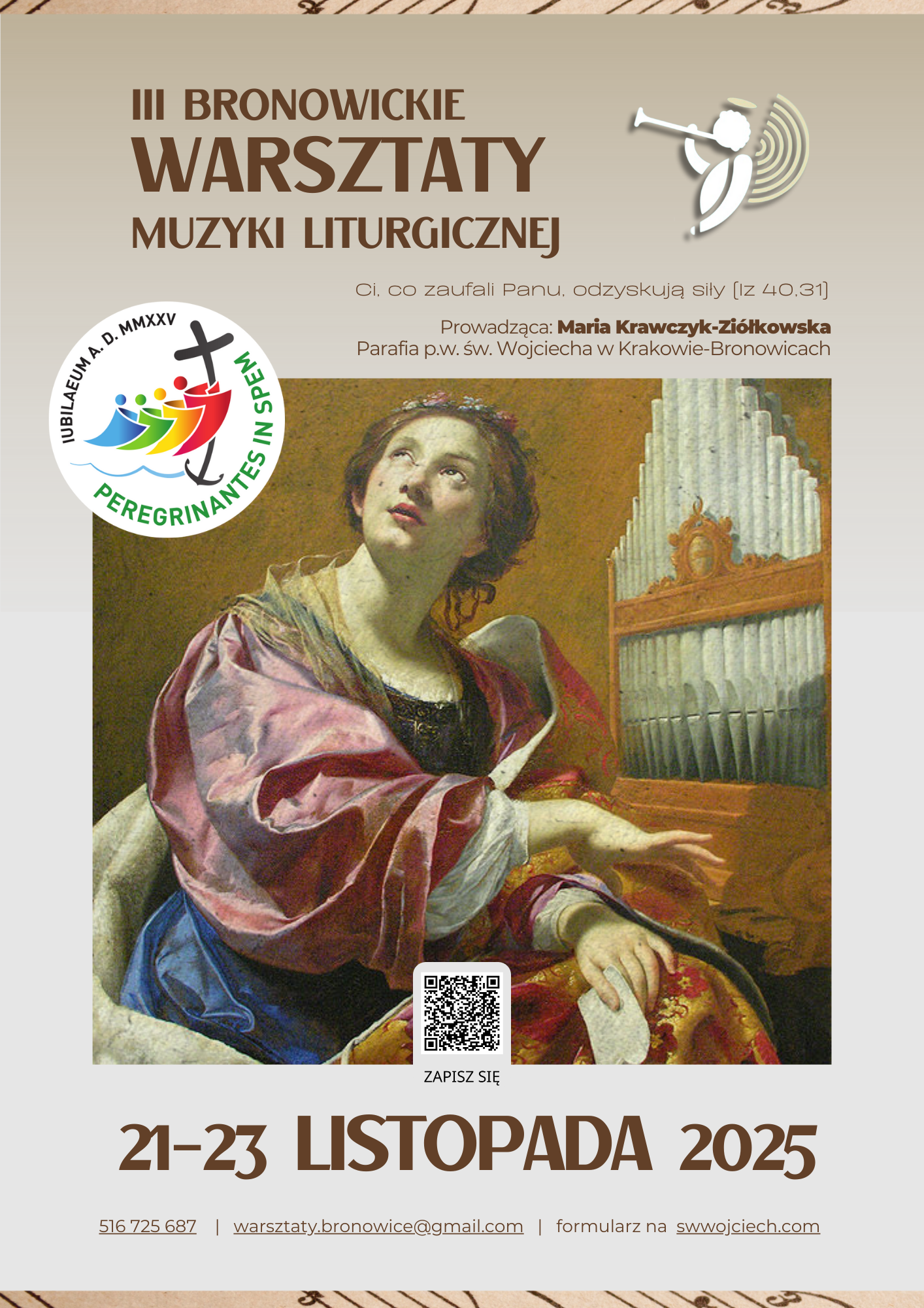 Zapraszamy na Bronowickie Warsztaty Muzyki Liturgicznej. To już trzecia ich edycja. Pierwszą poprowadził Piotr Pałka w 2022 roku, druga odbyła się rok temu pod okiem Marii Krawczyk-Ziółkowskiej. Postanowiliśmy, że trzecią również będzie dyrygować Maria. Hasłem tegorocznych warsztatów są słowa z Księgi proroka Izajasza: „Ci, co zaufali Panu, odzyskują siły” (Iz 40,31). Jest to nawiązanie do hasła Roku Jubileuszowego 2025, które brzmi „Pielgrzymi nadziei”. Naszą szczególną opiekunką będzie św. Cecylia – patronka śpiewu kościelnego i chórów, której wspomnienie będziemy obchodzili w czasie trwania warsztatów tj. 22 listopada.