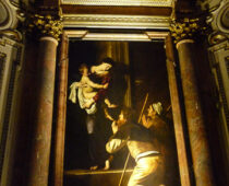 Można w niej również znaleźć obraz Caravaggia „Madonna dei Pellegrini”, na którym dwóch utrudzonych wędrowców zwraca się z błaganiem o wsparcie do Maryi, trzymającej na swym ramieniu Dziecię Jezus. Promieniuje od niej światło oznaczające nadzieję na szczęśliwe osiągnięcie przez nich celu.